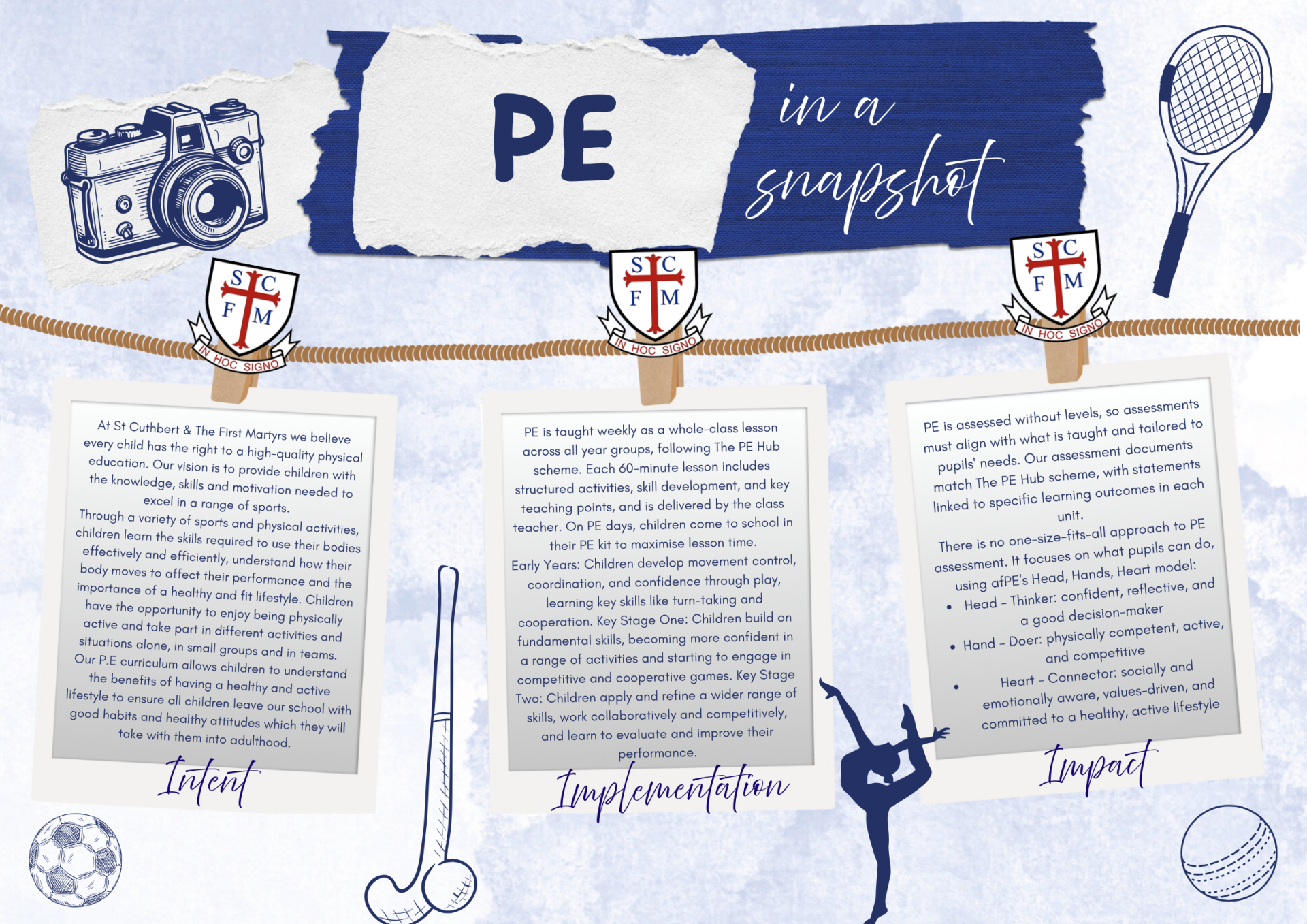 At St Cuthbert & The First Martyrs we believe every child has the right to a high-quality physical education. Our vision is to provide children with the knowledge, skills and motivation needed to excel in a range of sports. Our P.E curriculum allows children to understand the benefits of having a healthy and active lifestyle to ensure all children leave our school with good habits and healthy attitudes which they will take with them into adulthood.